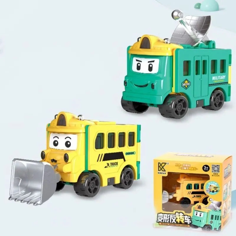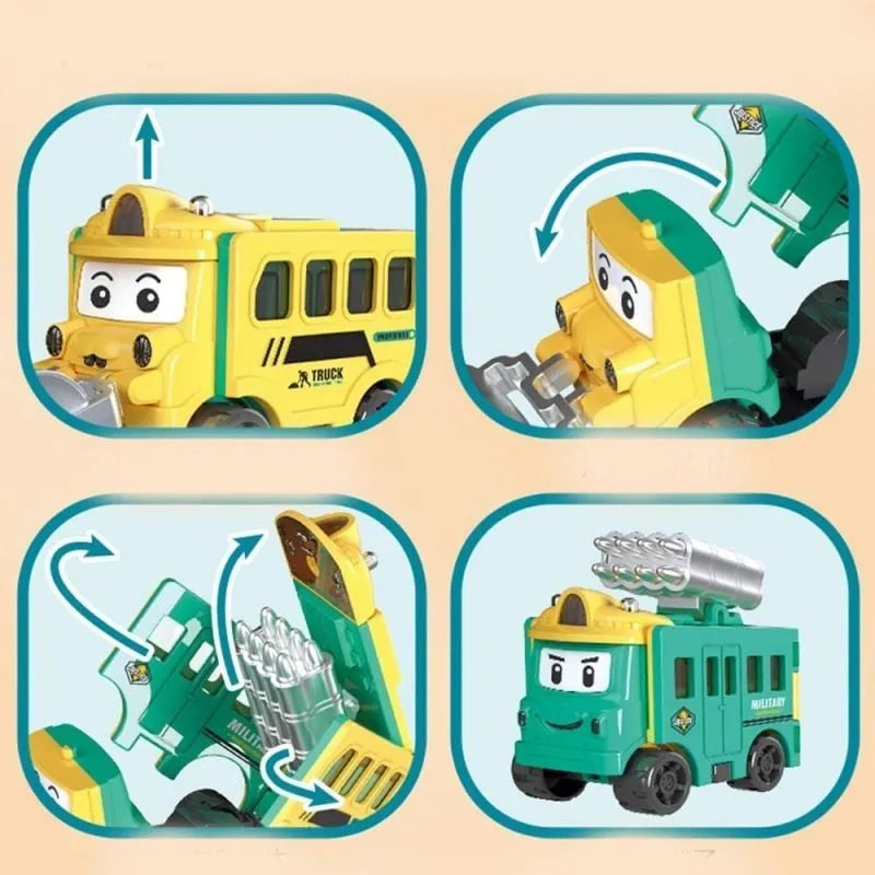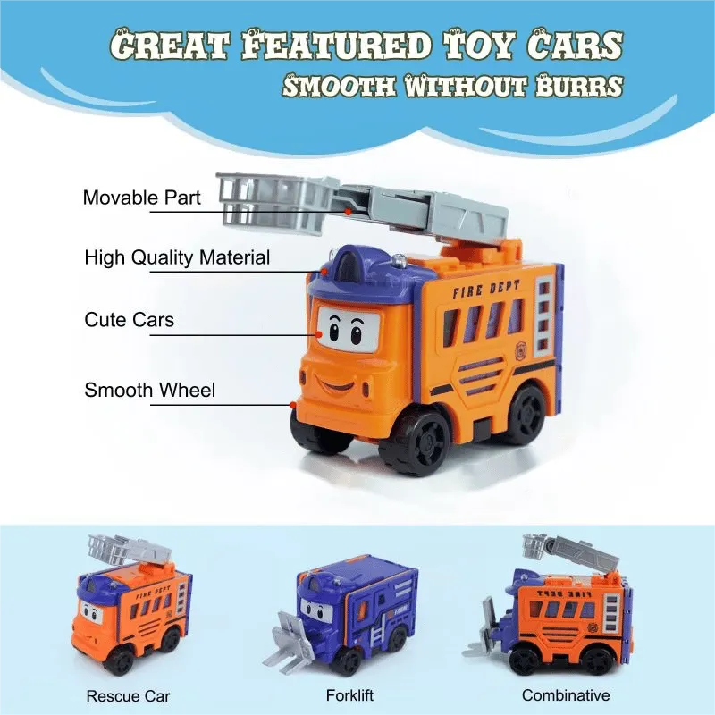 [Könnyen játszható];Nincsenek apró alkatrészek, így nagyon biztonságos a gyermekek számára. Az autók átalakíthatók az ajtóik, tetőjük, alvázuk és vezetőfülkéjük elforgatásával. Ez egy szórakoztató és oktató játék szett kisgyermekek számára.